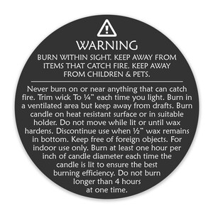 Candle Safety Labels | Candle Warning Labels Supplier 50mm Candle Safety Label incl. VAT £0.60 - £300.00 2 of 2 Items Candle Safety Labels Scents Soaps and Candles have candle safety labels that are 50mm in diameter and are ideal for just about every application. Under the General Product Safety Regulation of 2005 you must have a safety warning on your candle if you are selling candles.